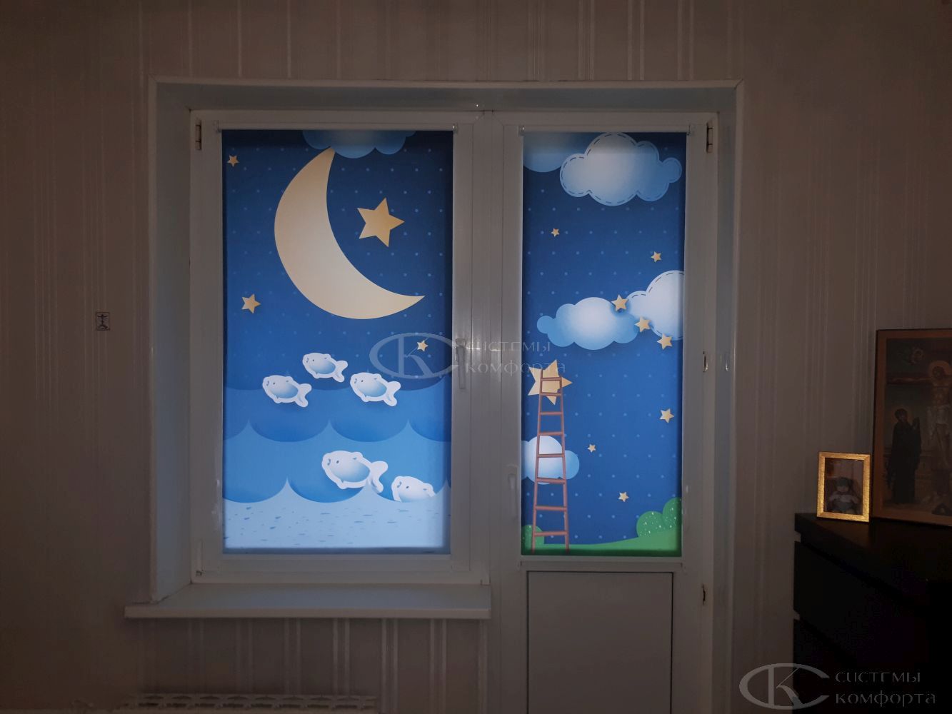 Рулонные шторы с рисунком в виде звезд, месяца или изящных цветов – прекрасный выбор для спальни. Спокойные тона настраивают на полноценный отдых, сочетаются с однотонными обоями и текстильными принадлежностями.